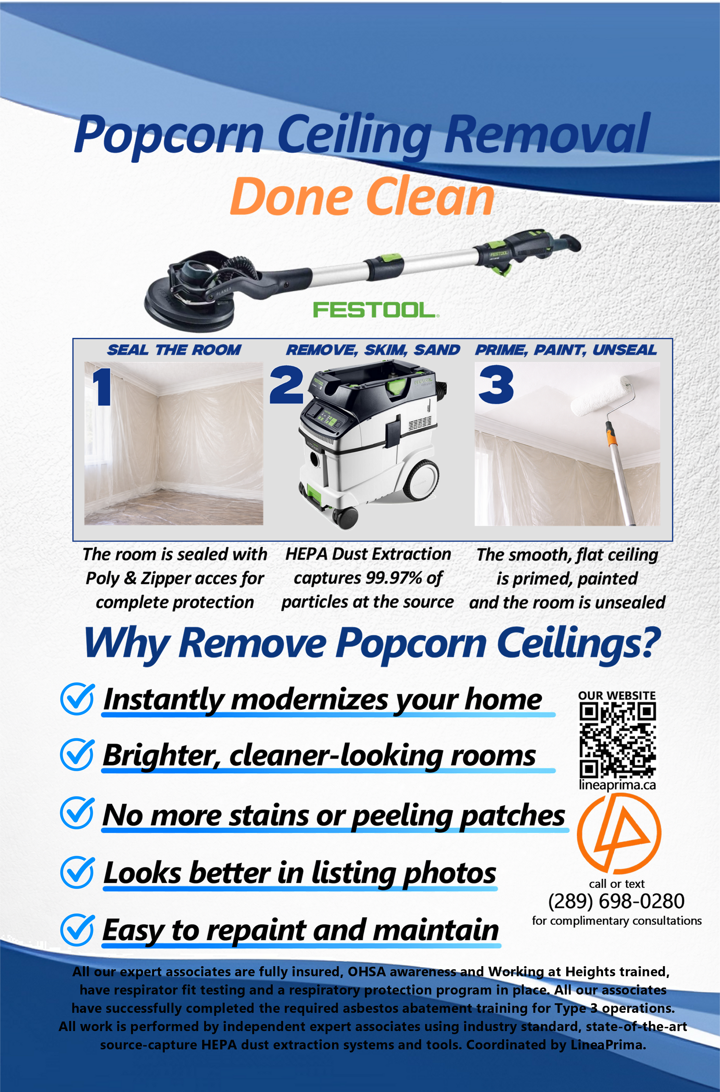 Our specialists are OHSA awareness trained, Working at Heights compliant, and have respirator fit testing and a respiratory protection program in place. All our associates must be type 3 asbestos abatement certified.
